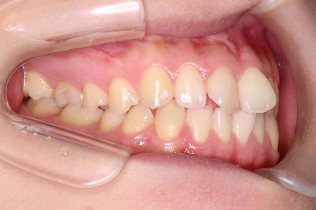 初診時の奥歯の噛み合わせは上の歯と下の歯が1歯対1歯で噛めているので、奥歯はそのまま動かさず、