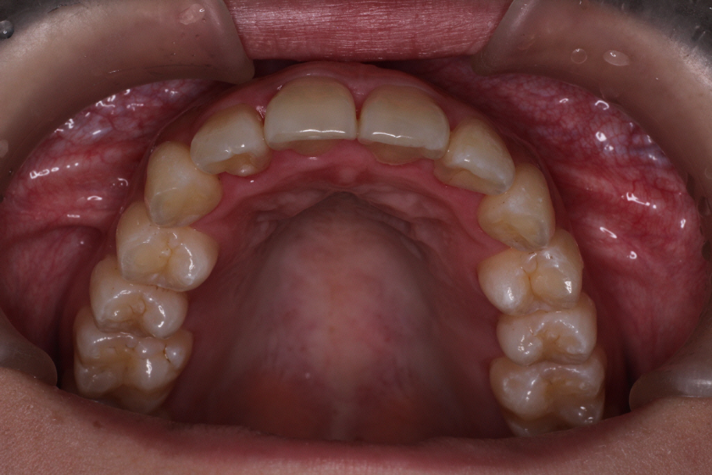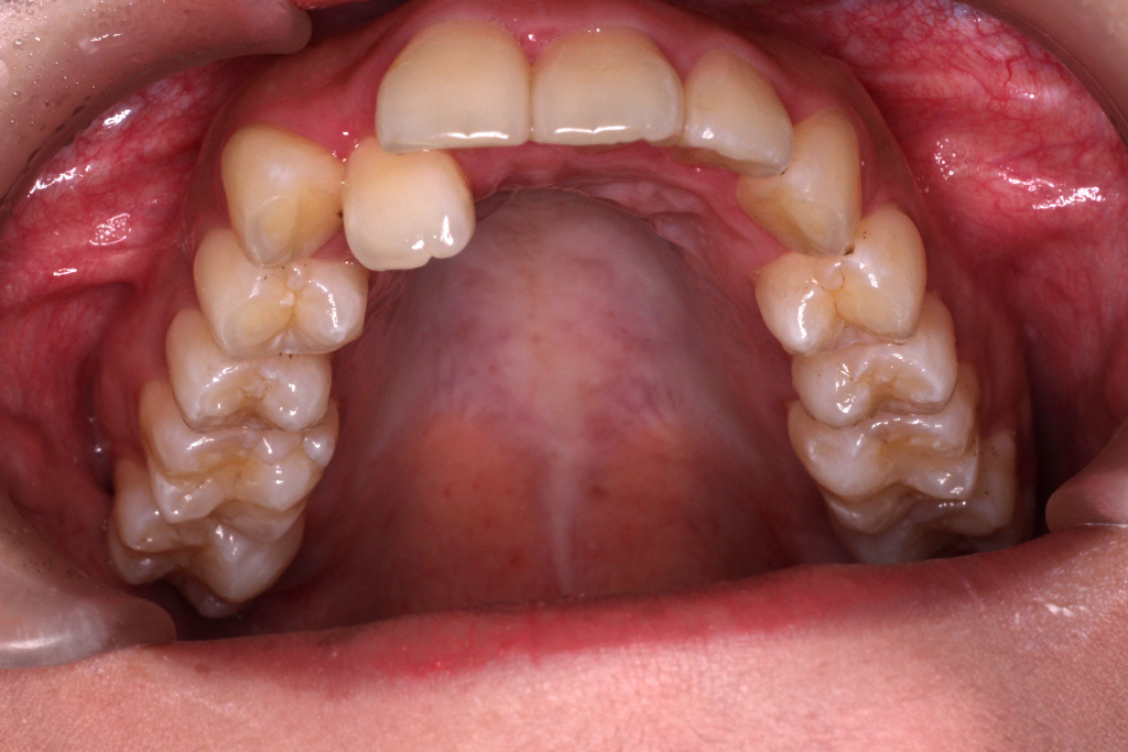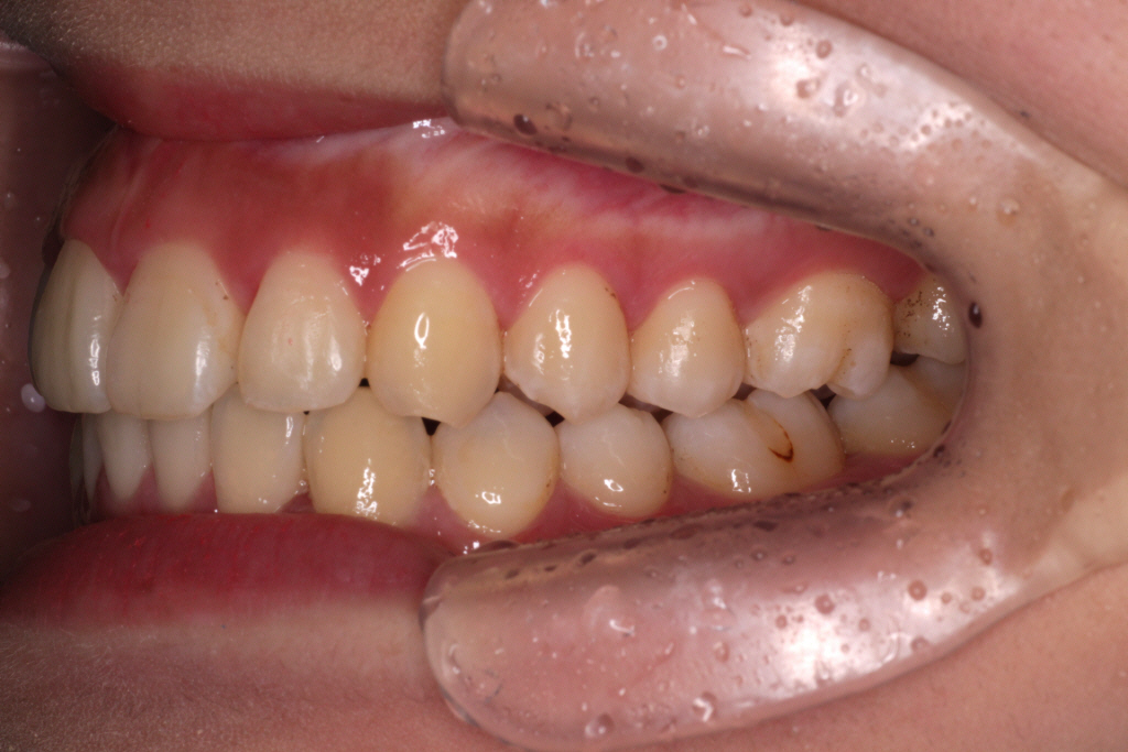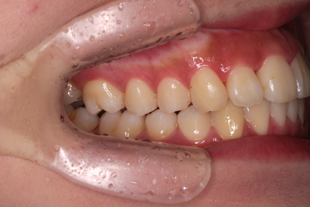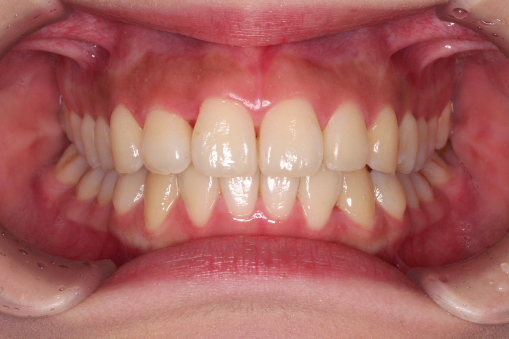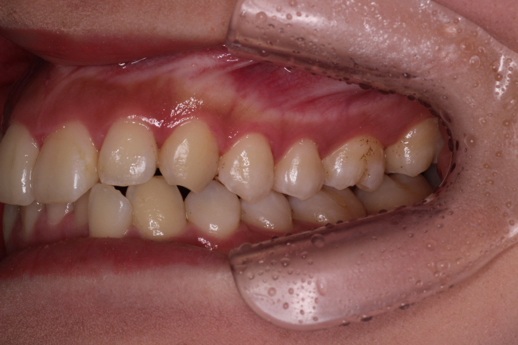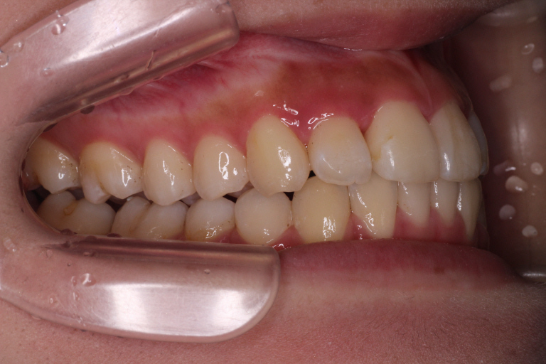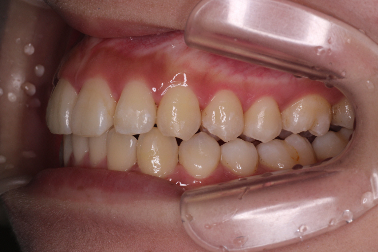 初診時、噛み合わせが深く、バイトランプの効果があまり得られず、まだ歯が内側に倒れていることがわかります。