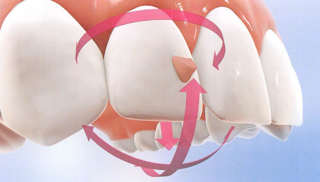 例えば、治療中の上顎側切歯(上の前から二番目の歯)の移動は、挺出、唇舌側傾斜、回転と