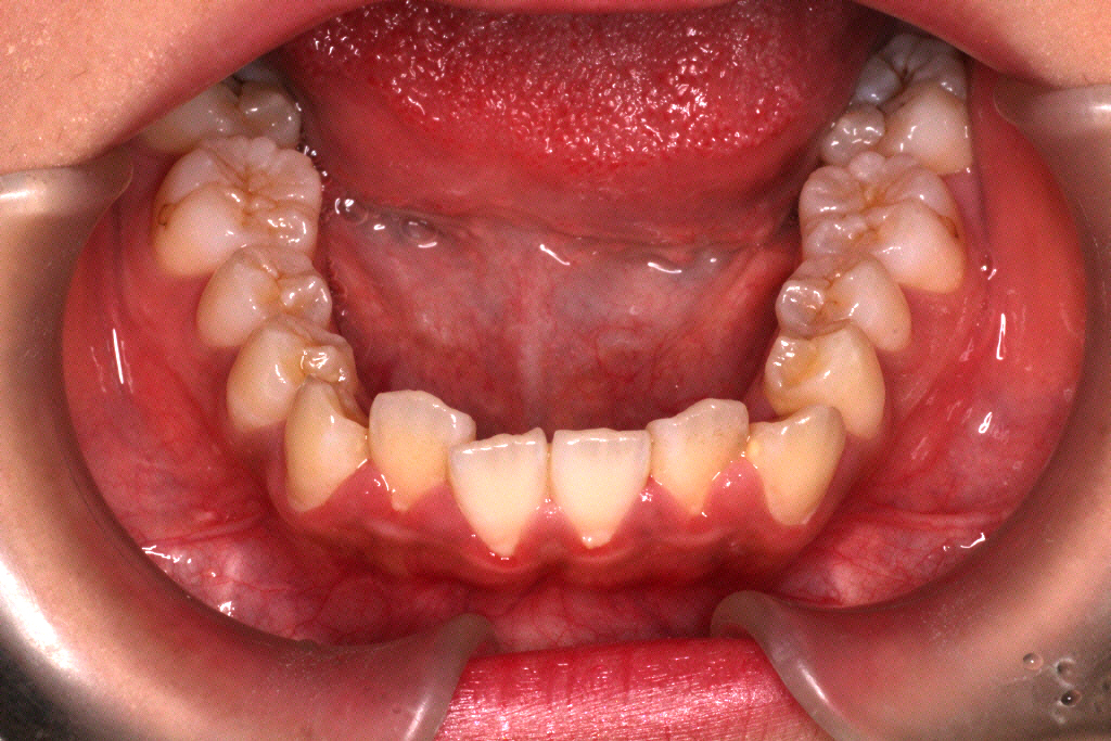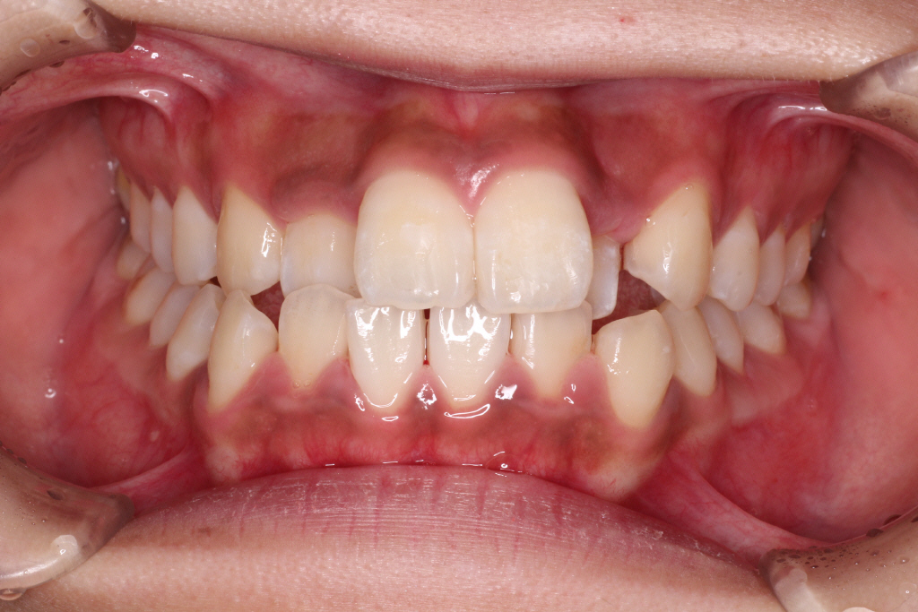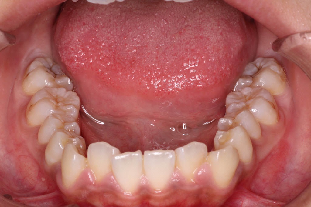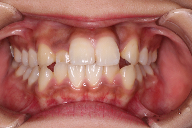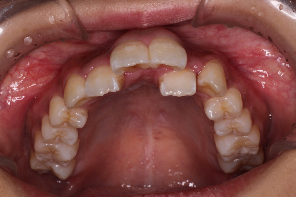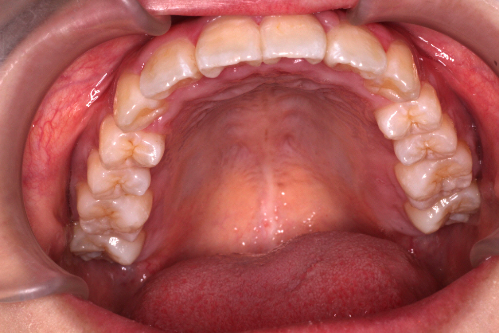 上の前から2番目の歯が下の歯列より内側にあり叢生です。