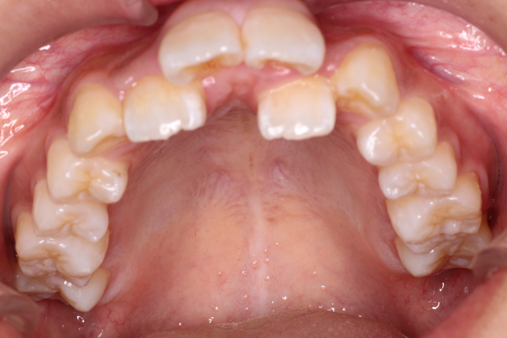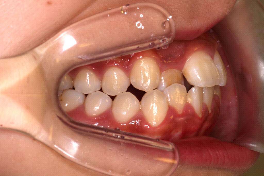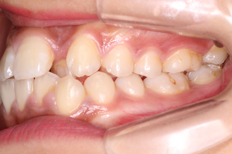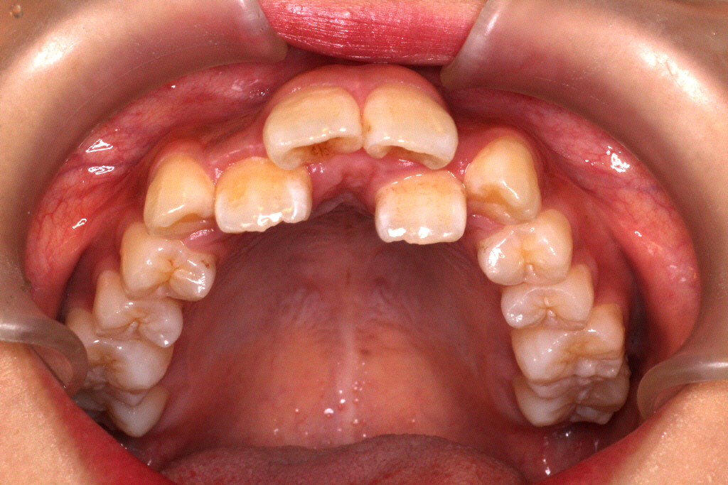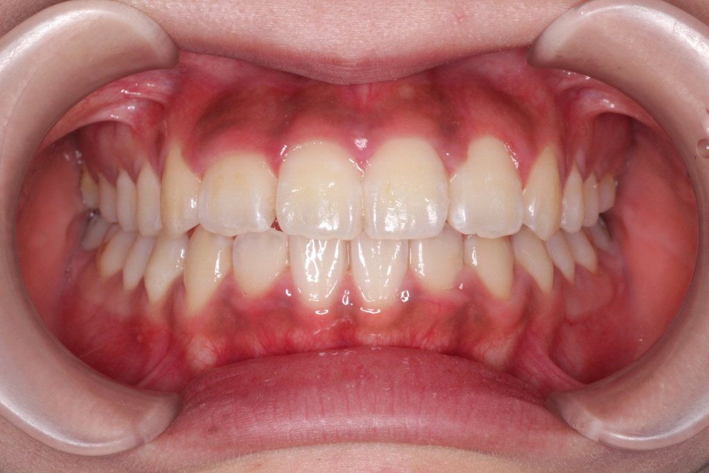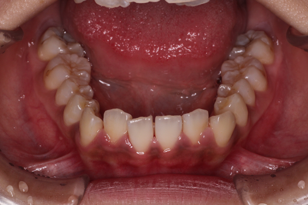 上の前から2番目の歯が下の歯列より内側にあり叢生です。