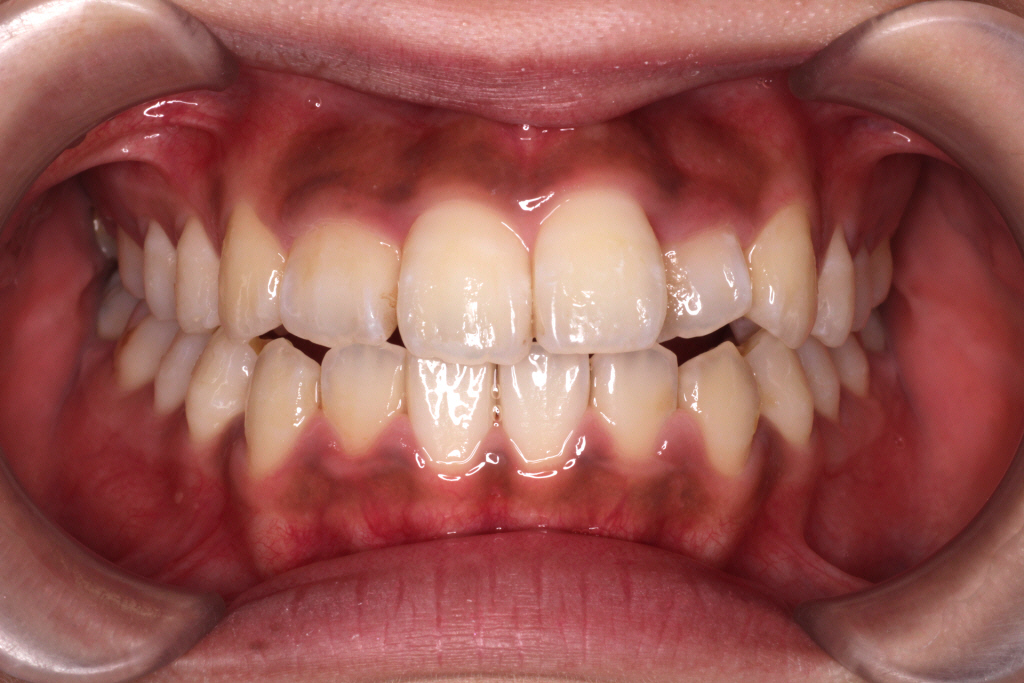 ・長期間にわたって重なっていた歯は、歯間接触下部の歯肉組織が失われている場合があり、歯列矯正を行うことで、「ブラックトライアングル」が発生する可能性があります。