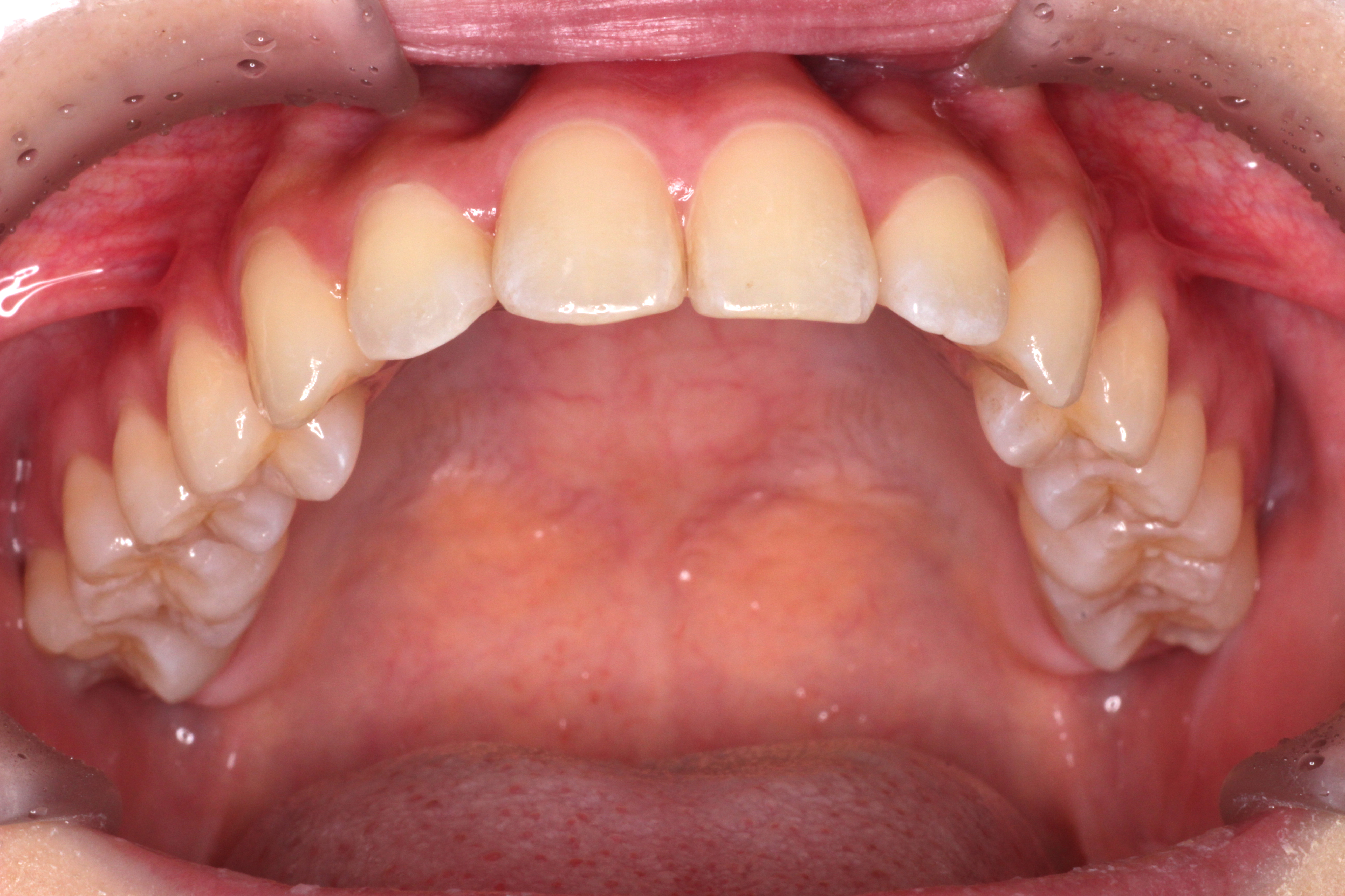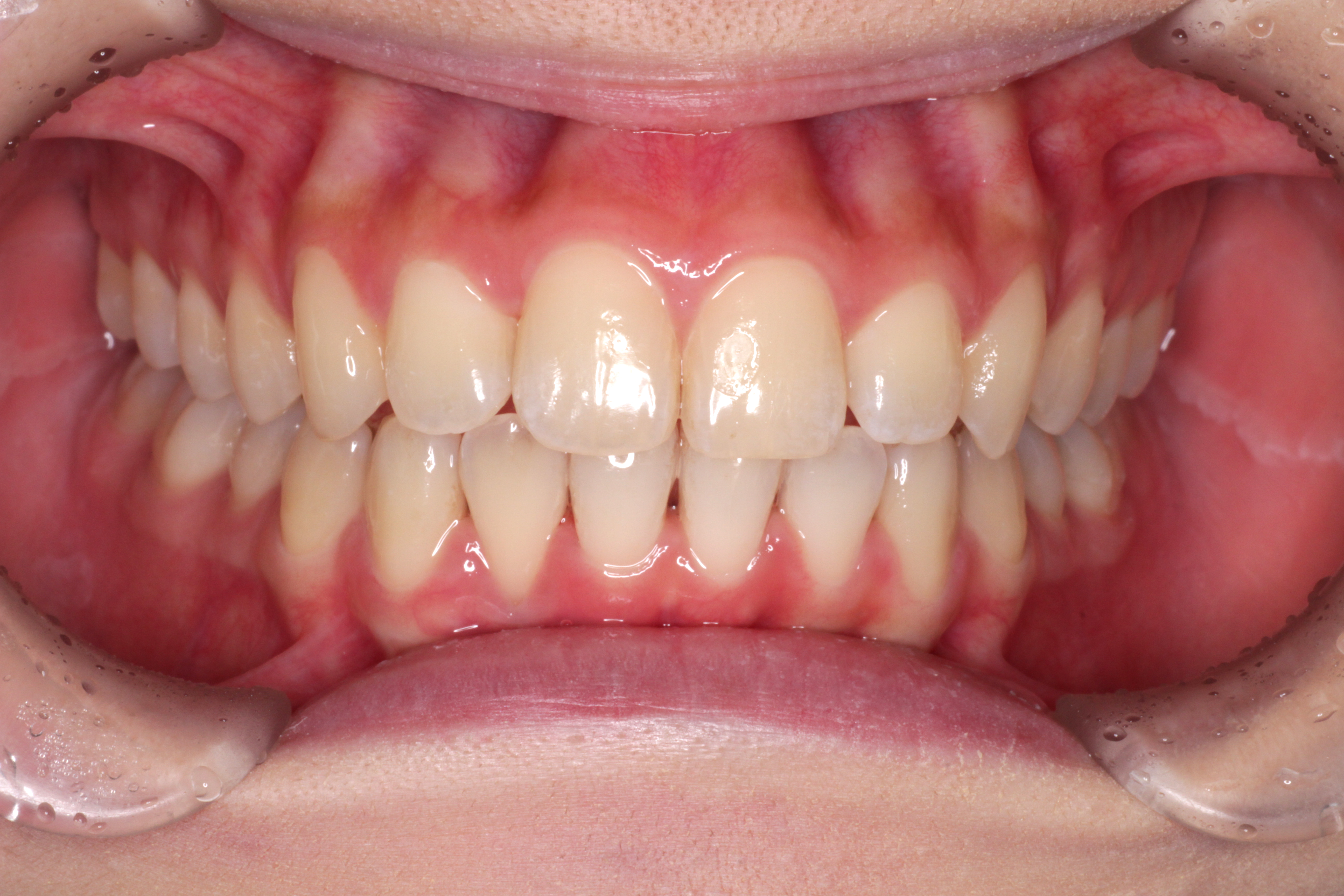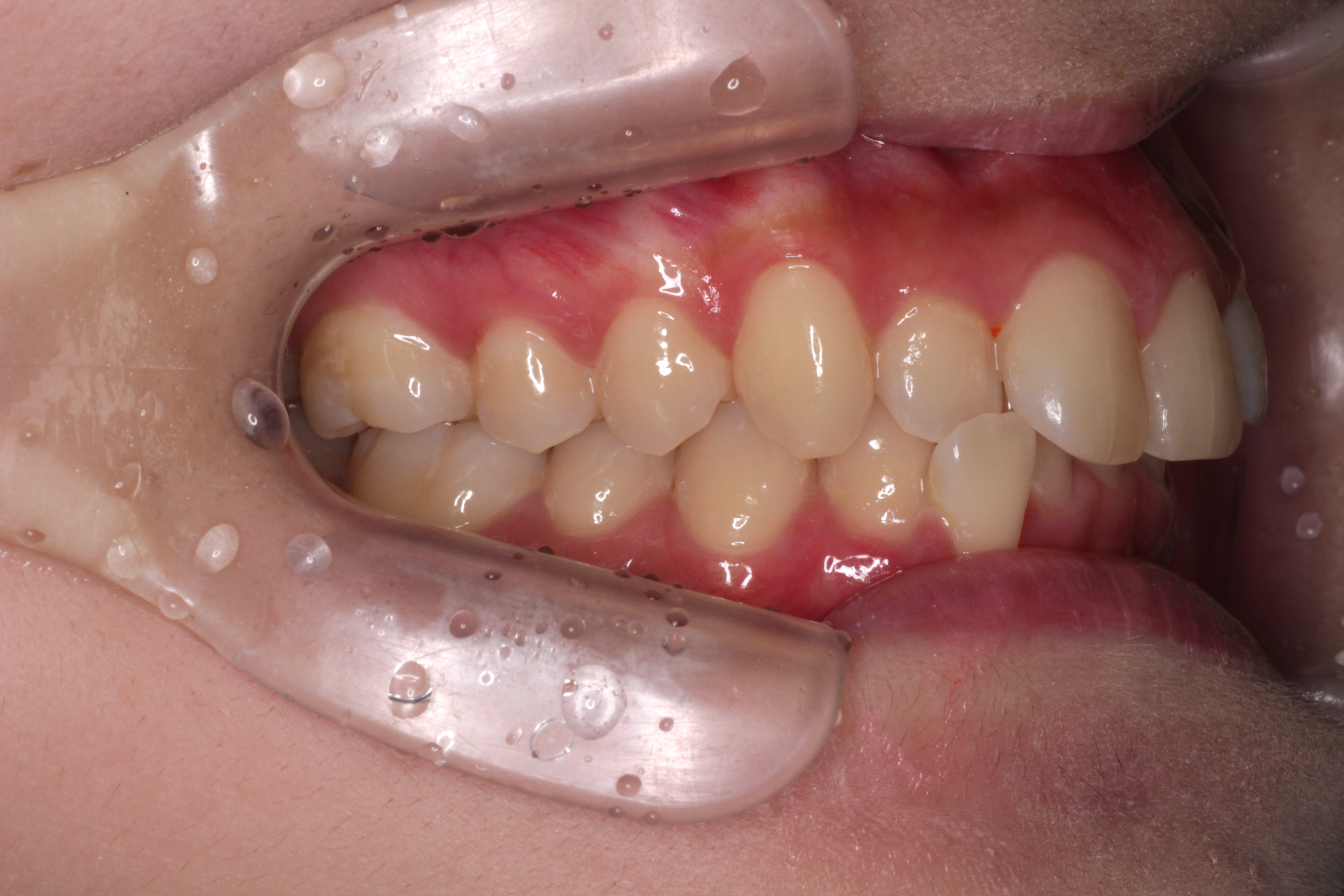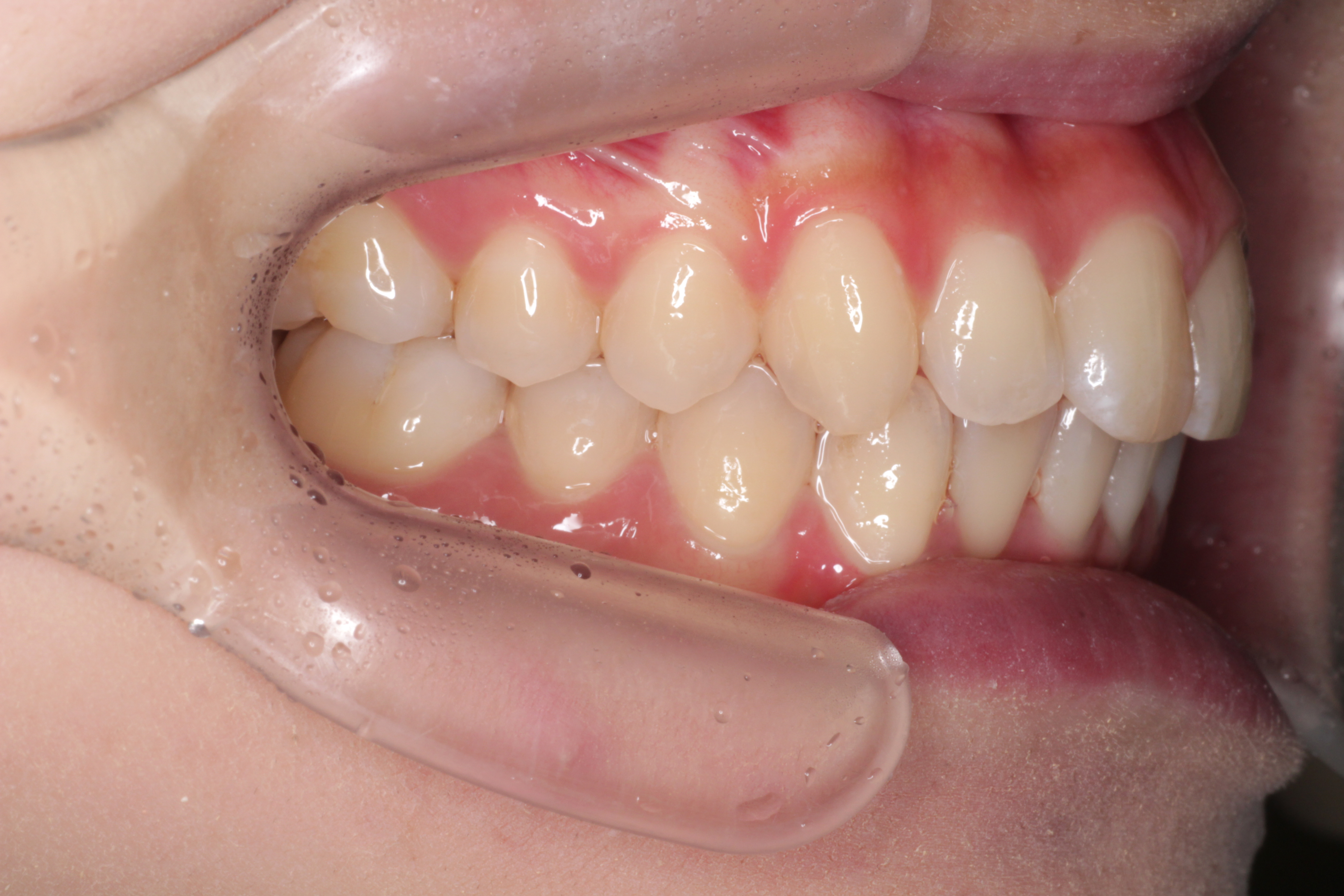 ⑶右上の2番目の歯は下の歯より前に出ましたが、咬み合わせが浅いです。