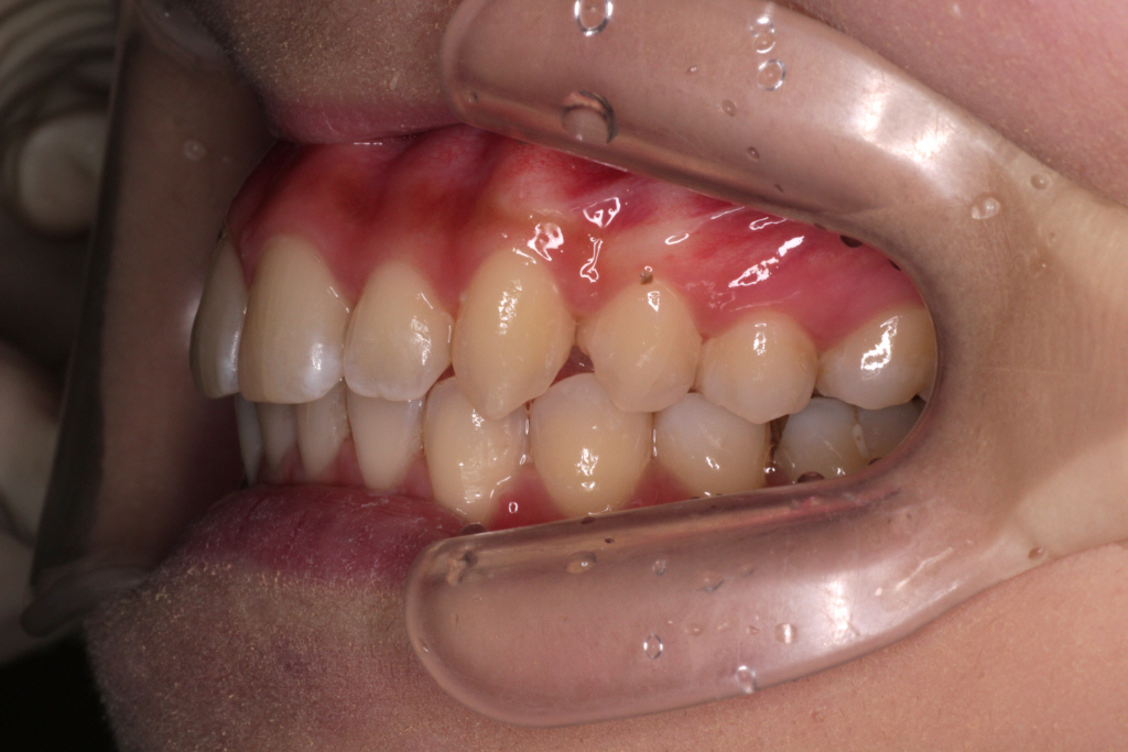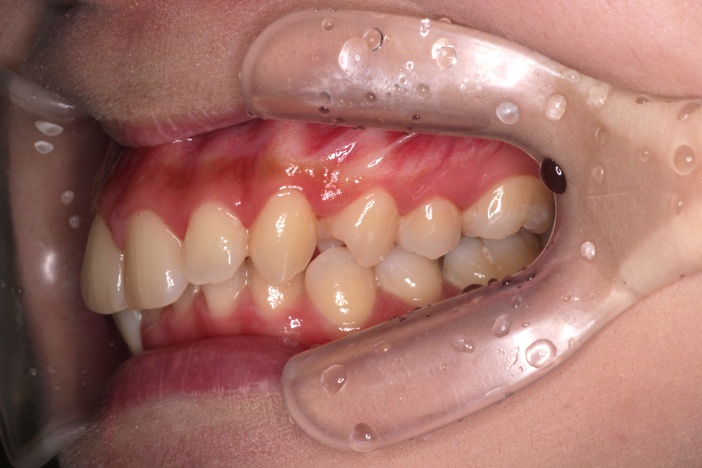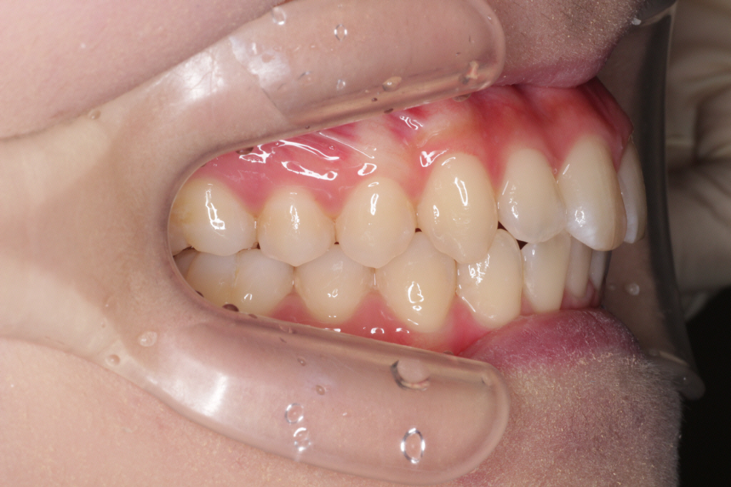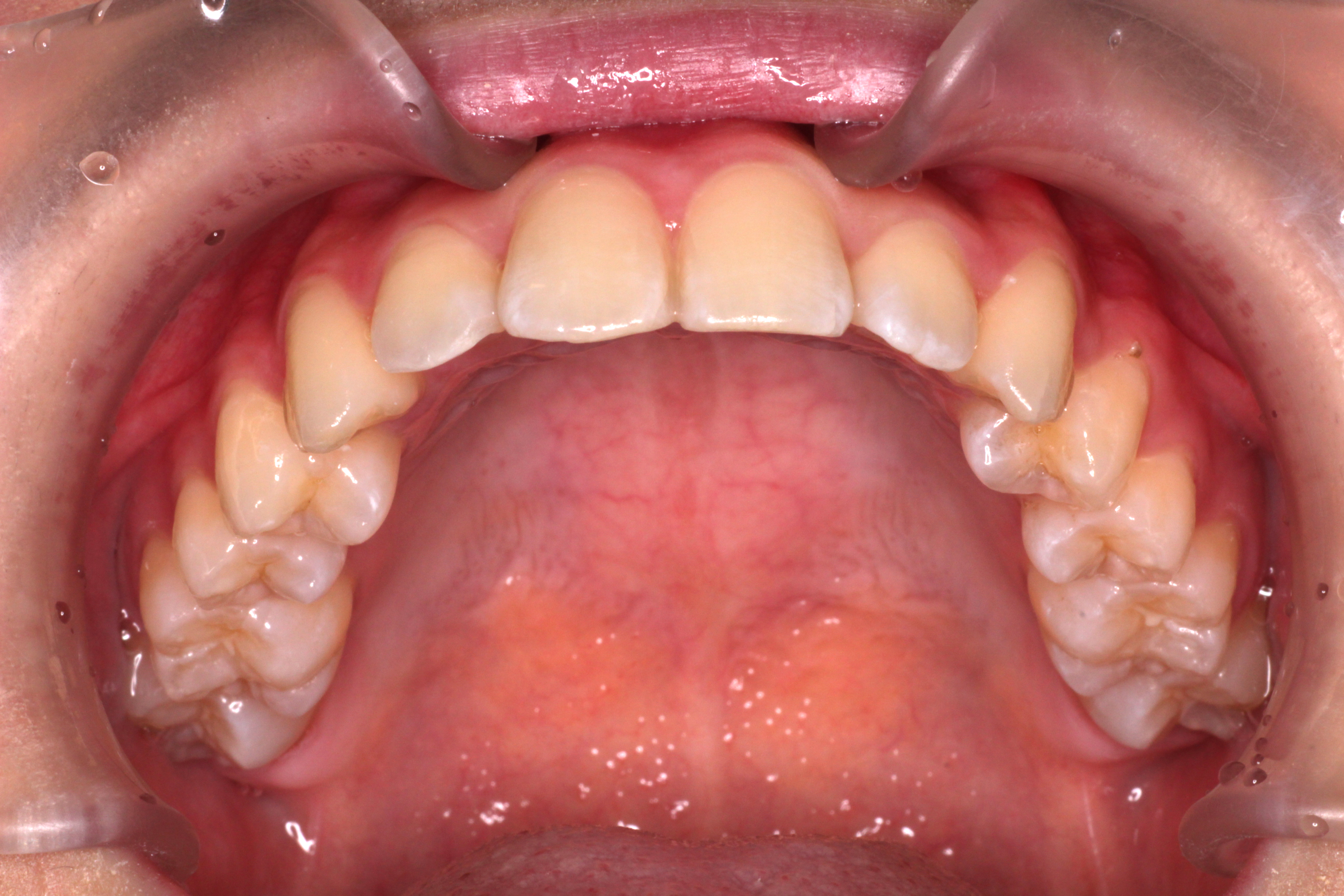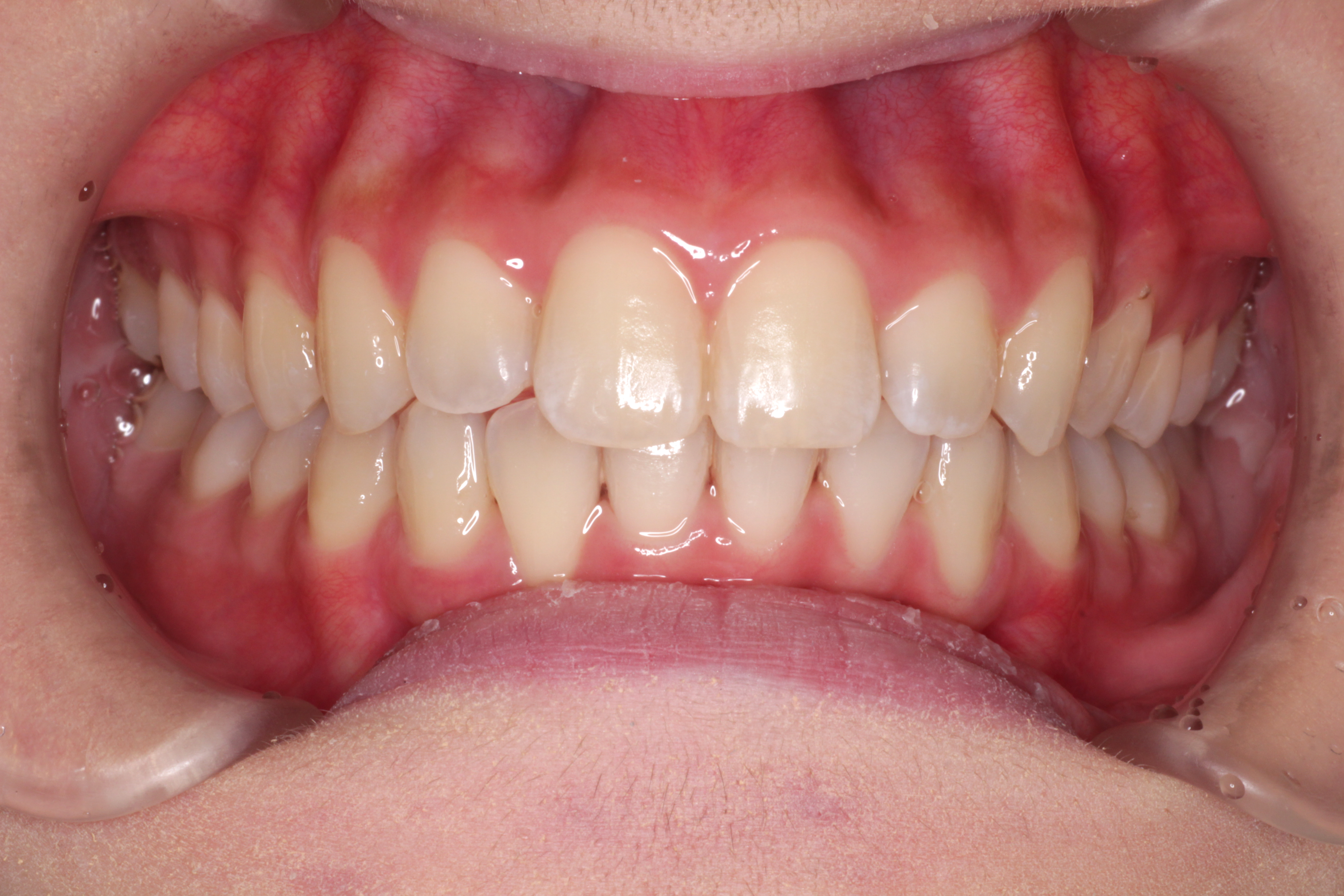 ⑶右上の2番目の歯は下の歯より前に出ましたが、咬み合わせが浅いです。